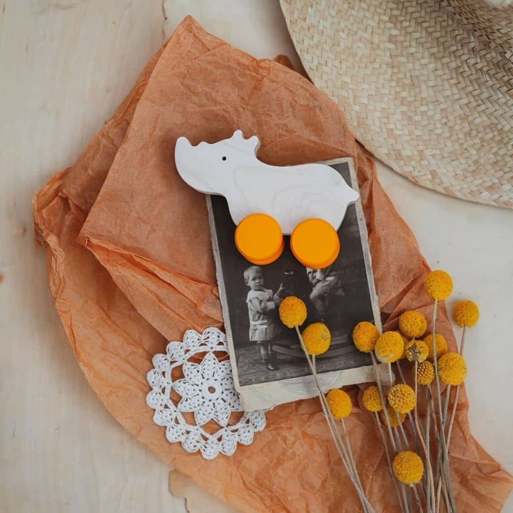Roztomilá dřevěná hračka nosorožec je vybavena žlutými kolečky a dítko si s ní tak užije spoustu zábavy. Velikost je ideální pro malé dětské ručky. Tato dřevěná hračka bude stimulovat představivost a fantazii dítěte a rozvíjet jeho jemnou motoriku.