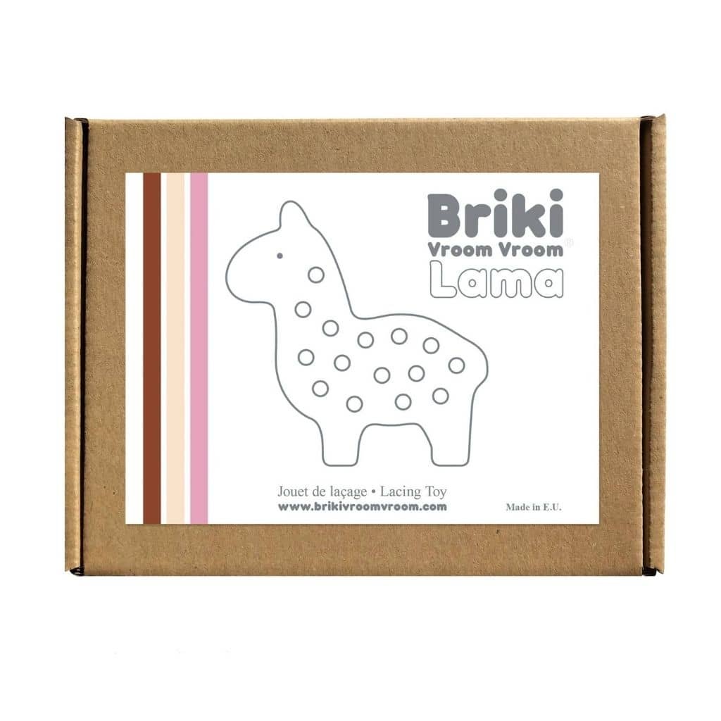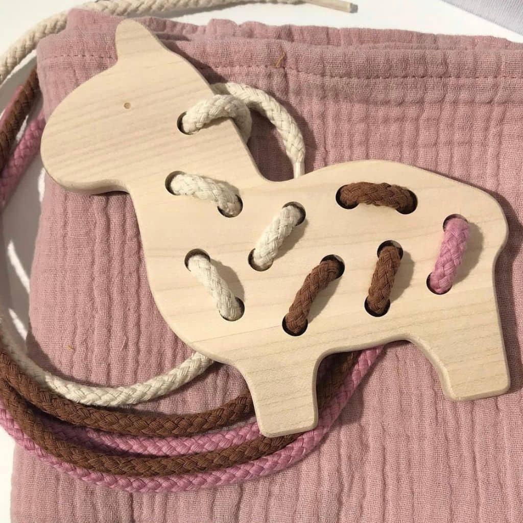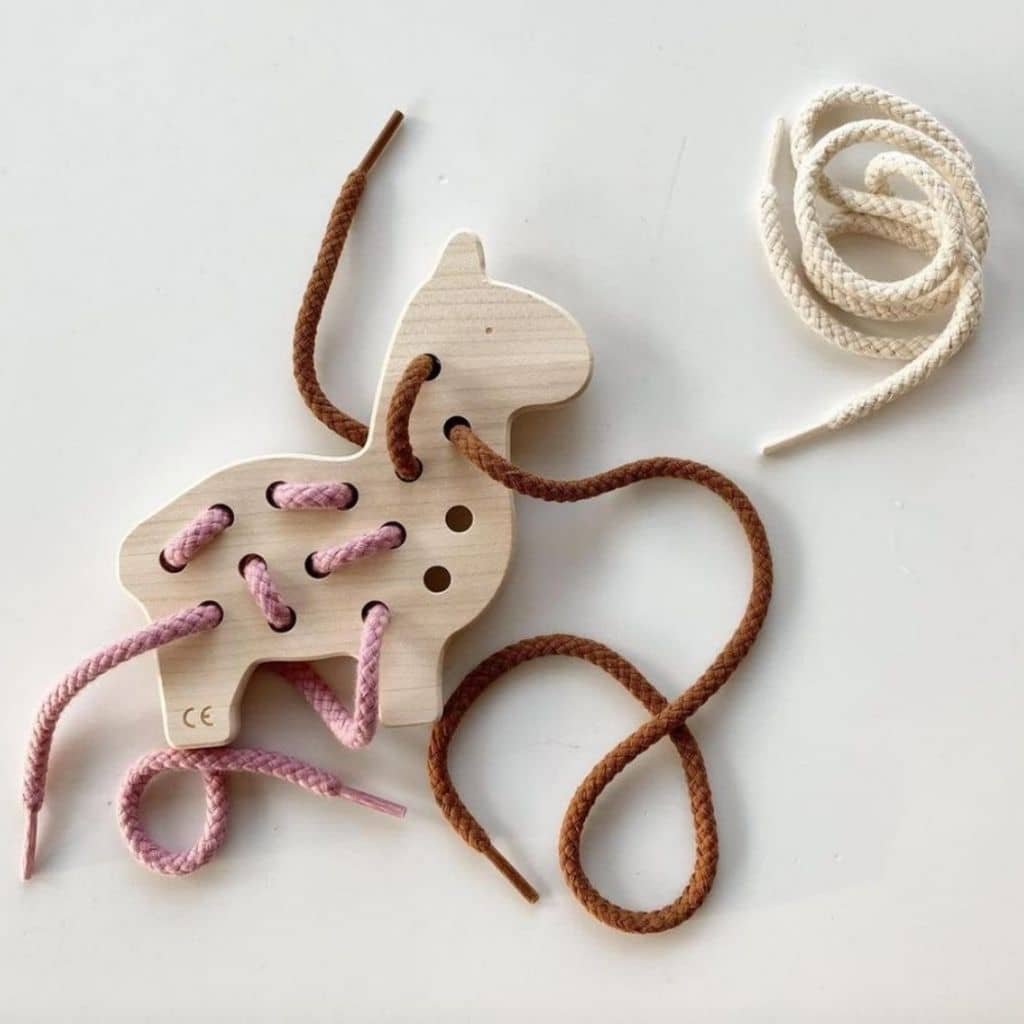 Zábavná provlékačka pro děti v podobě dřevěné lamy. Součástí provlékací hračky jsou tři různě barevné tkaničky - hnědá, béžová, růžová. Tkaničky jsou dlouhé 80 cm.