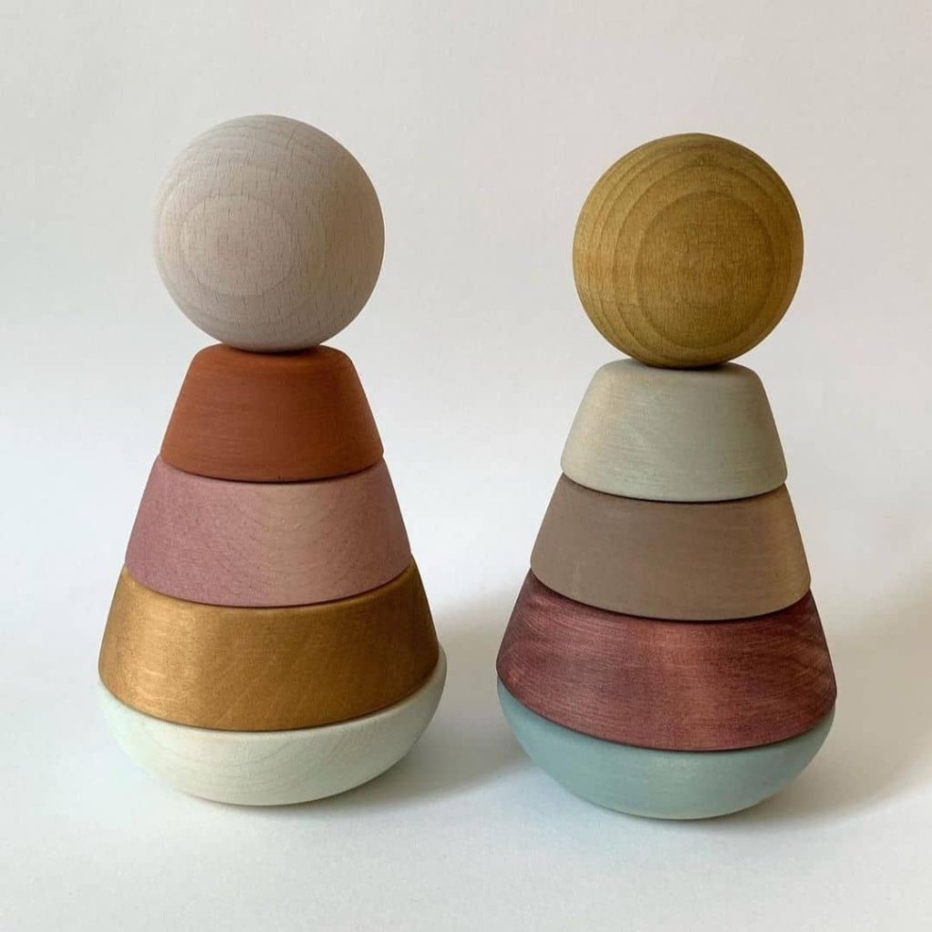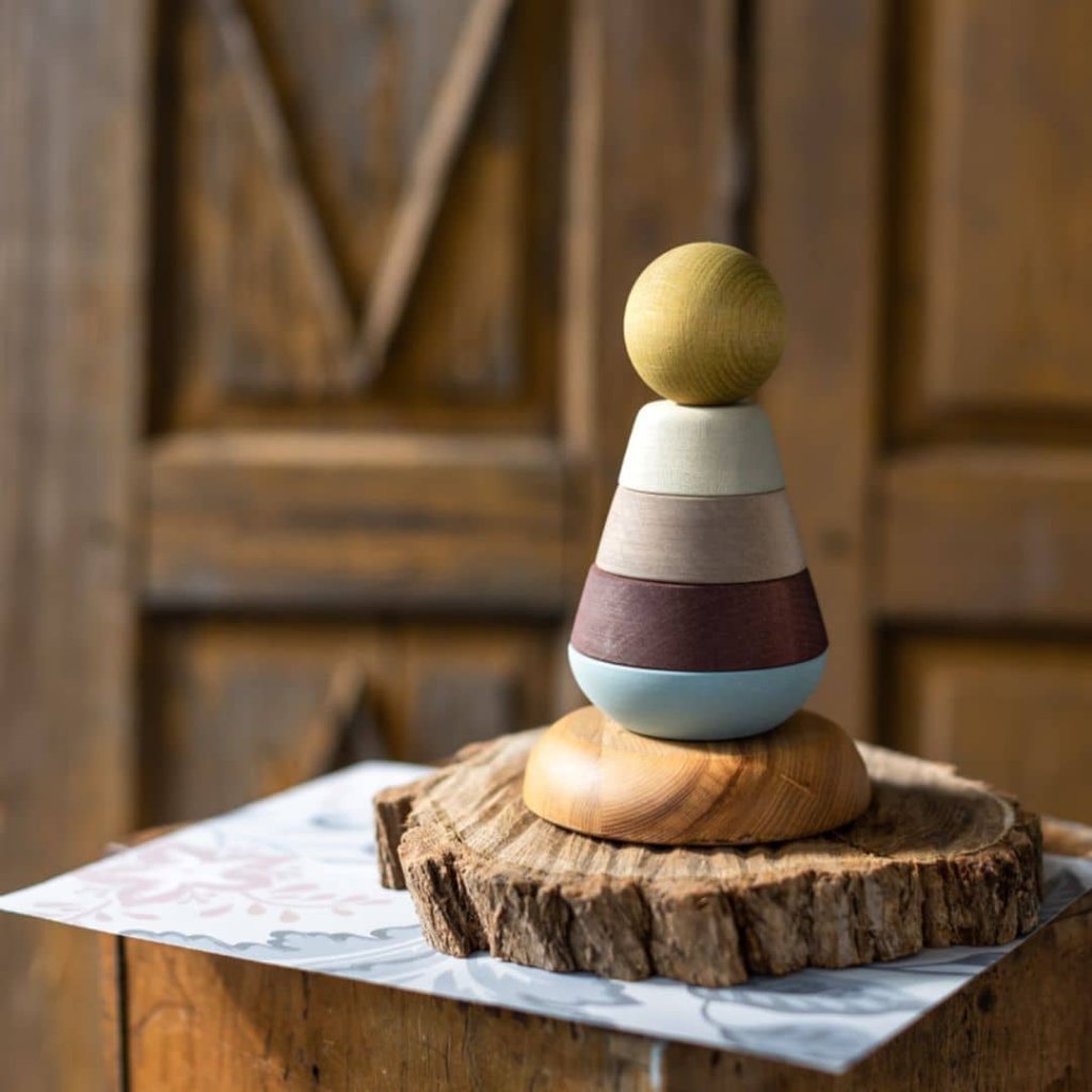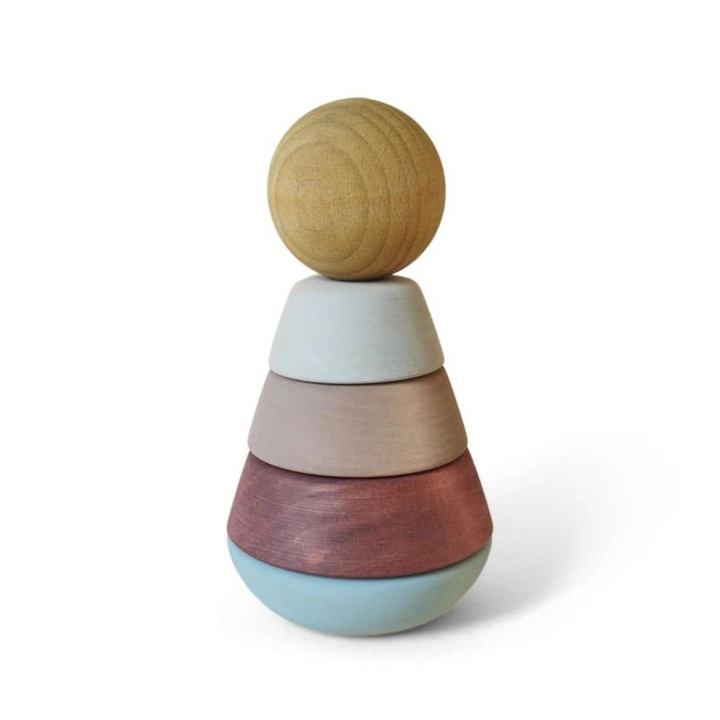 Minimalistická stohovací hračka s kouličkou na vrcholu. Zábavná dřevěná hračka, která pomáhá dítku stimulovat představivost, ale i prostorové vnímaní a s ním spojené logické myšlení. Dřevěná skládací věž rozvíjí také jemnou motoriku.
