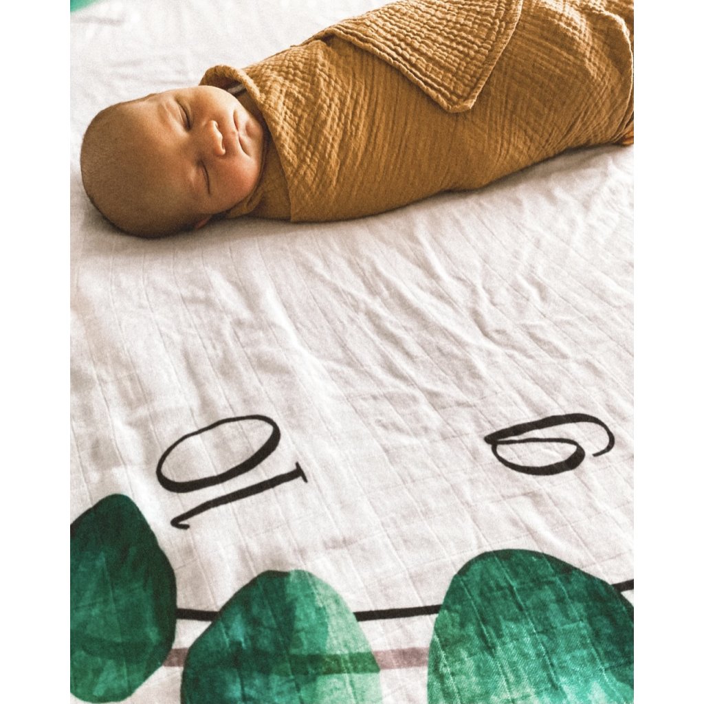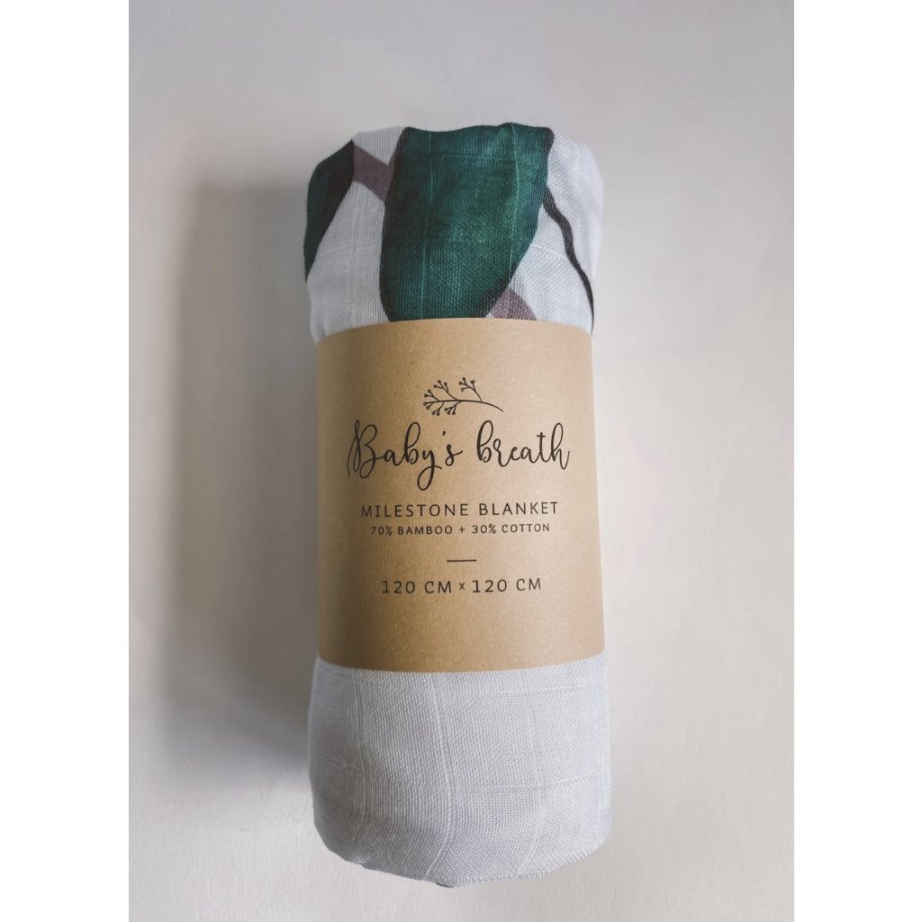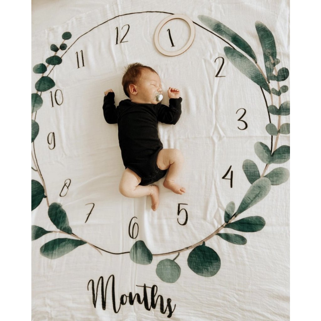 Mušelínová plena s motivy eukalyptu a číslicemi od 1 do 12 a nápisem „month", která bude sloužit pro zaznamenávání toho, jak Vaše děťátko roste a Vy budete mít krásnou památku. A nejen to. Mušelínová plenka bude skvělým pomocníkem při nejrůznějších příležitostech.