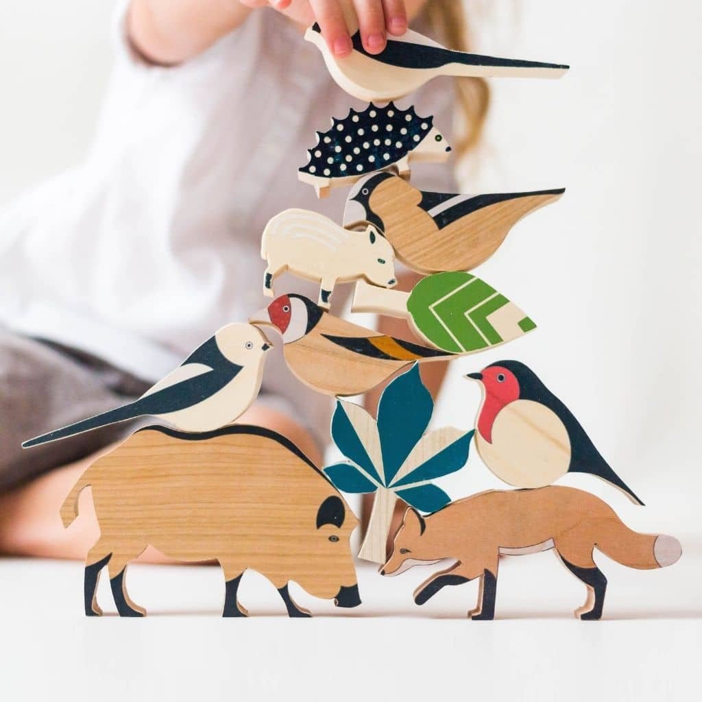 Ze zvířátek lze postavit BALANČNÍ VĚŽ. Dřevěná zvířátka a stromy rozvíjí představivost dětí a zároveň je učí o divoké přírodě.