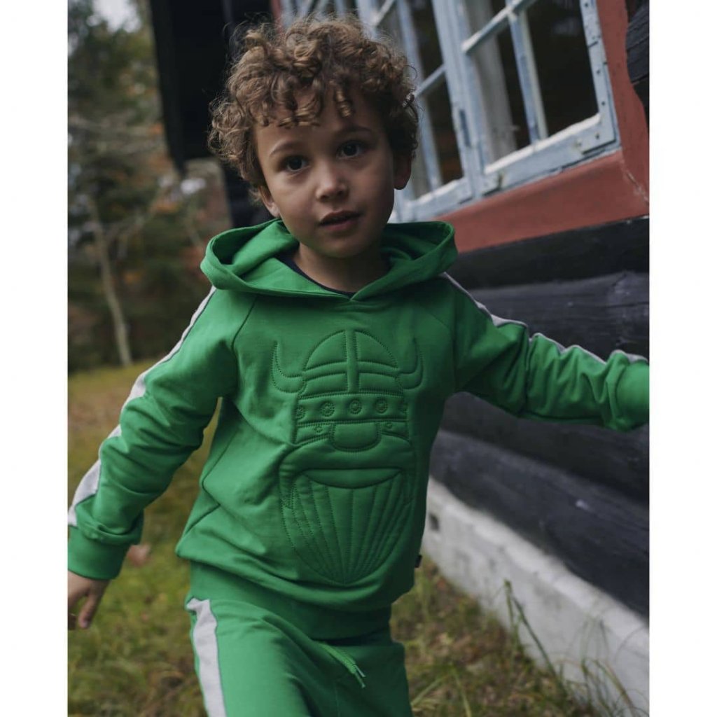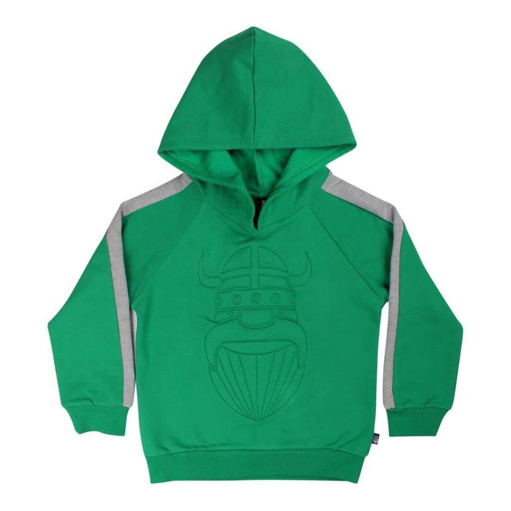 Nádherná chlapecká mikina v jasně zelené barvě. Tato dětská mikina s kapucí je ozvláštněná krásnou výšivkou vikinga Erika a šedými pruhy na rukávech. Barva i tvar zůstanou stále krásné a nepoškozené i po opakovaném praní. Mikina je velmi příjemná na nošení a byla navržena tak, aby poskytovala komfort při hraní a pohybu.